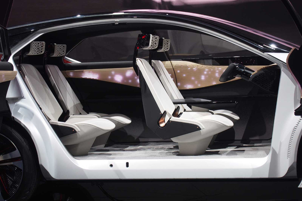 Dveře jsou zavěšeny na svých vnějších hranách a při otevření odhalí futuristický a prostorný interiér se čtyřmi sedadly plynulé vyrůstajícími z podlahy.
