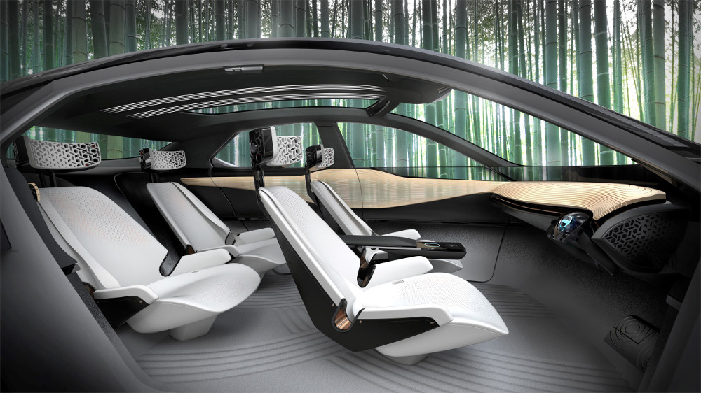 Panoramatická přístrojová deska OLED nabízí pohled na okolní prostředí v pozadí. Samostatný displej s texturou dřeva pod přístrojovou deskou a okolo čalounění dveří dává osobám ve vozidle pocit propojení s venkovním světem, stejně jako tradiční japonské papírové dveře shoji.