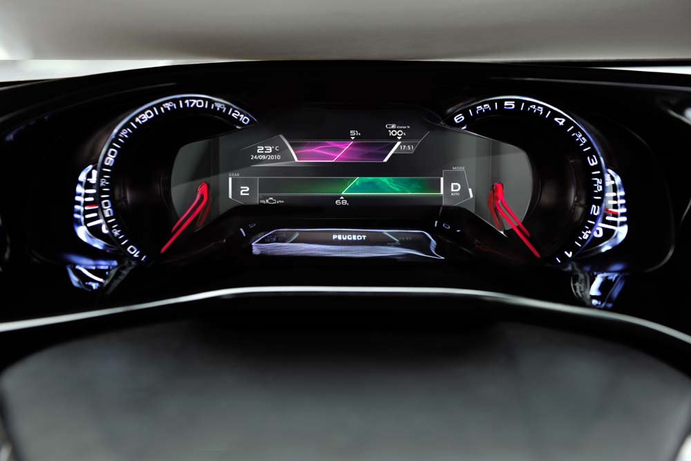 Interiér zůstává věrný trendům představeným u nejnovějších modelů Peugeot. Řidič i spolujezdec mají každý svůj vlastní prostor oddělený středovým panelem, který přispívá k futuristickému vzhledu interiéru jako celku a prosvětlení prostoru (zabudované diody). Prosklená střecha se skládá ze dvou částí oddělených zvlášť pro řidiče a spolujezdce, jsou elektrochromatické a podle potřeby lze zvolit menší zastínění.