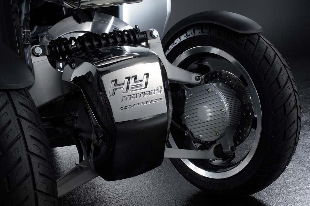 Koncept HYmotion3 compressor je jízdním prostředkem, který nemá žádnou přímou vazbu na určitý typ vozidla. S třemi koly a dokonale aerodynamickým tvarem vytváří chybějící článek mezi dvěma dnes velmi odlišnými světy: světem skútrů a automobilů. S elektrickým motorem v každém ze dvou předních kol spojeným s benzinovým motorem vzadu přináší inovativní řešení hybridní technologie, umožňující pohon všech kol.