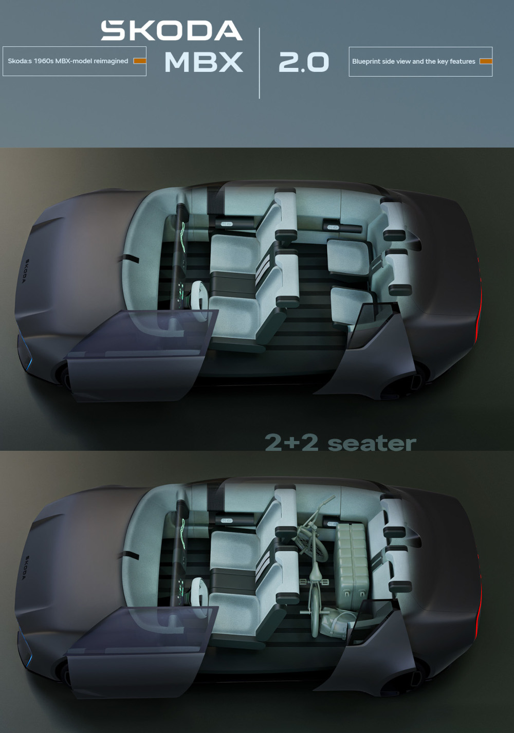 Díky přenesení podstaty auta do dnešní doby je Škoda 1000 MBX ve stylu jazyka Modern Solid vlastně takový crossover, i když tak na první pohled nevypadá. David Stingl totiž přišel se zcela originálním pojetím interiéru s uspořádáním sedadel v konfiguraci 2 + 2. Přední sedadla jsou díky ploché podlaze elektrické platformy, kterou by moderní vize mohla mít, propojena do pohodlné široké lavice, zadní dvě sedadla jsou samostatná a po vzoru sedaček v kině mají vzhůru výklopné sedáky. Zároveň vůz dostal originální řešení dveří otevíraných proti sobě, což zajišťuje skvělý přístup do interiéru.