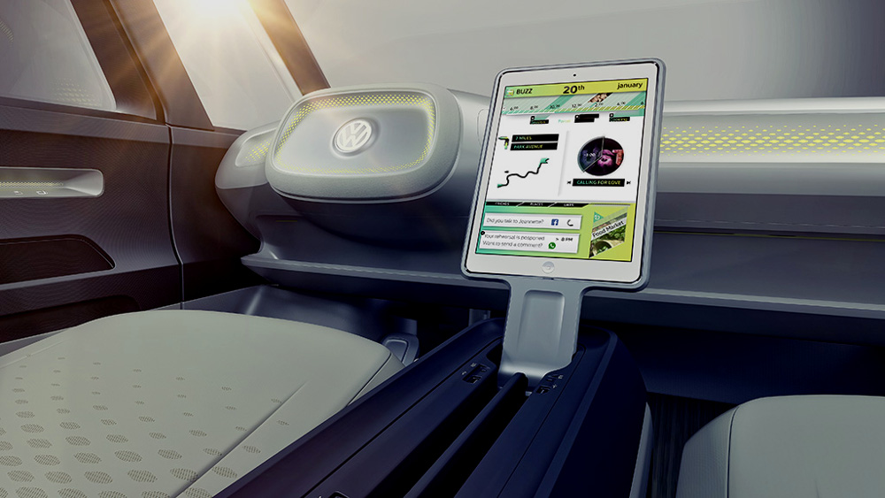 I.D. BUZZ nemá klasickou přístrojovou desku. MPV promítá nejdůležitější informace prostřednictvím průhledového displeje s rozšířenou realitou do zorného pole řidiče – ve formátu 3D, virtuálně na vozovku. Funkce informačních a zábavních systémů nebo klimatizace jsou ovládány prostřednictvím vyjímatelného tabletu. Ovládací prvky důležité pro řízení jsou umístěny na volantu. Jeho vnitřní část není – na rozdíl od současnosti – tvořena rameny a tlačítky, ale speciální dotykovou plochou s kapacitními zónami. Klasický volant se tak proměnil v multifunkční volant s dotykovou plochou.