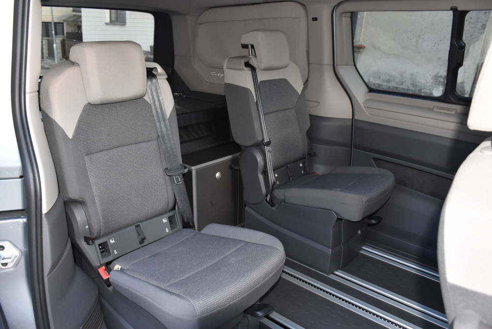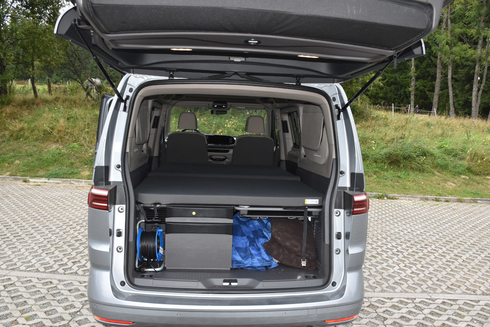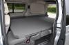 V dolní části jednoduše překlopíte opěradla zadních sedadel do vodorovné polohy a na ně rozložíte matraci o velikosti 1980 x 1330 mm, na které se pohodlně vyspíte ve dvou. Komu by připadala tvrdá, pak doporučujeme přibalit si sebou nafukovací lehátka. Ale kam se zavazadly. Můžete je dát na přední sedadla, nebo využít i malý prostor vzadu. Drobnosti lze uložit ještě doma také do dvou odnímatelných textilních boxů, vyplňující prostor zadních bočních oken. Škoda, že nemají madla pro lepší transport.
