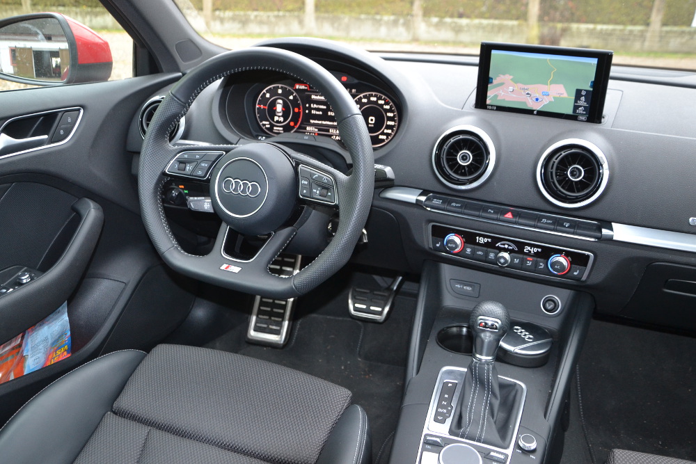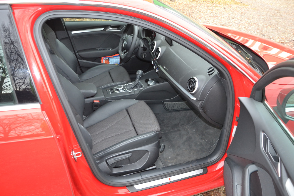 O tom, jak může zdání klamat, nás přesvědčila nabídka prostoru uvnitř. Zvnějšku vypadá 4,3 metru dlouhé Audi A3 poněkud skromně, což ovšem neplatí o elegantním sportovním designu, ale uvnitř nás překvapilo bohatým prostorem jak vpředu, tak i na zadních sedadlech. A k tomu ještě 380 litrů zavazadlového prostoru. Přední sedadla jsou spíš tužší, ale s možností prodloužení sedáku, čímž se pohodlí při cestování ještě zvýší. Všechny ovladače jsou po ruce, na některé prvky si musíte zvyknout, ale to není žádný problém.