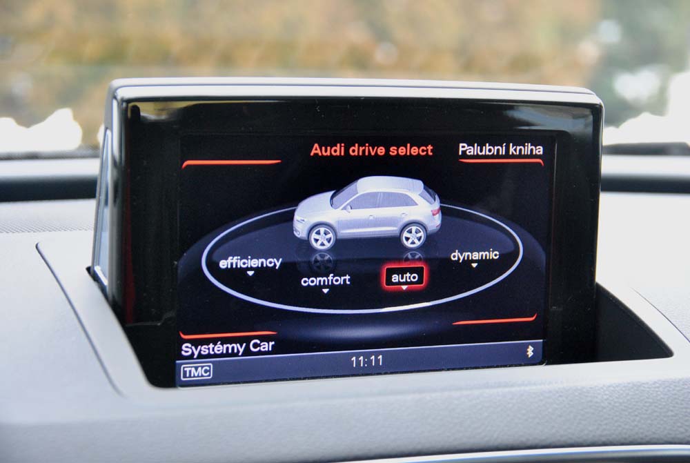 Pomocí Audi driver select jsme si vyzkoušeli všechny čtyři jízdní režimy, od komfortního přes dynamický, automatický až po úsporný. Nejvíce kilometrů jsme najezdili na dynamický režim, kdy se přitvrdí tlumiče i řízení a jízda dostává sportovní nádech. Comfort se zase dobře vypořádá s nerovnostmi na vozovkách. Ovšem tato „hračka“ není ve výbavě a musíte si za ni připlatit ca 5500 Kč, stejně jako za podvozek s regulovanými tlumiči (ca 27 000 Kč). Prostě nic není zadarmo, ale k tomu se ještě dostaneme.