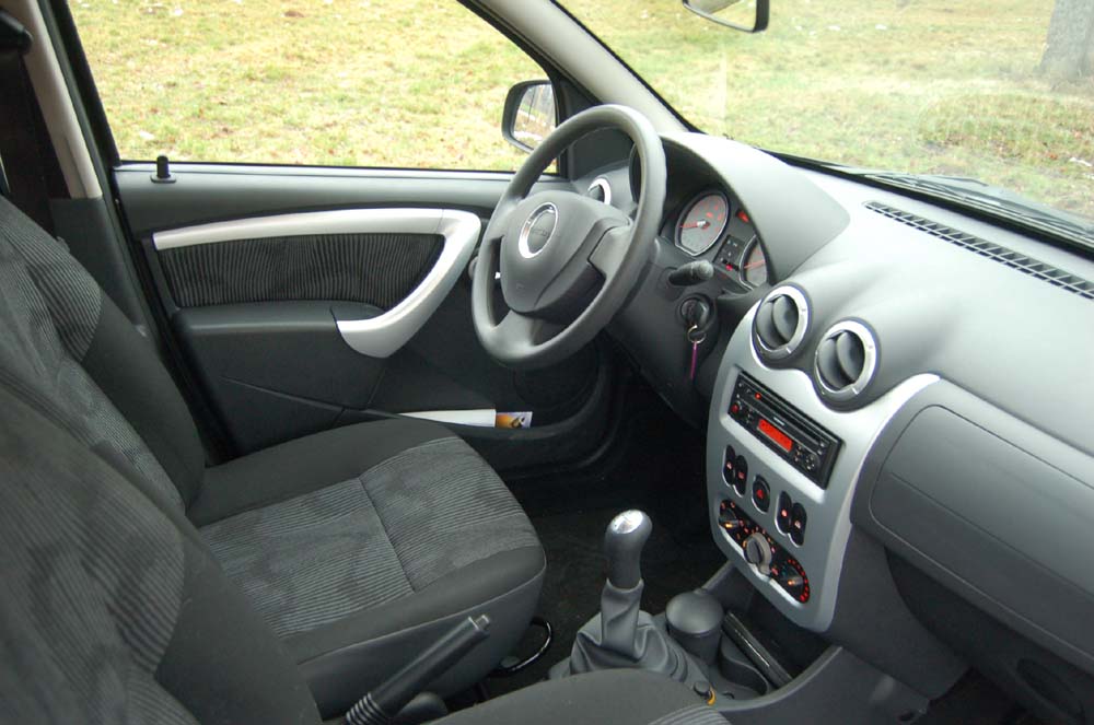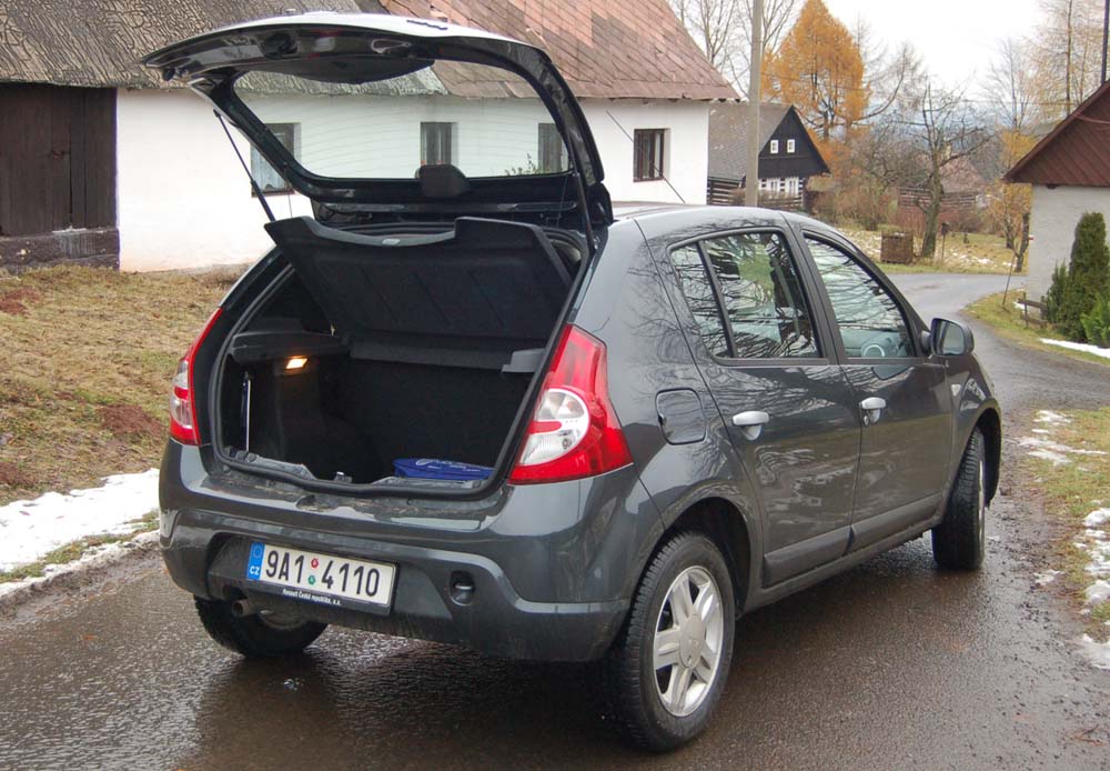 Také interiér vypadá dobře, vzadu mohou pohodlně cestovat dvě osoby, tři pak jako v každém jiném voze se musí uskrovnit. Pozvolna klesající střecha dává tušit, že i vzadu mají cestující dost místa na hlavu. Přední sedadla jsou dost široká, ale boční opora by mohla být o něco lepší. Na druhou stranu, Sandero rozhodně není určené pro sportovní jízdu, ale vyloženě rodinnou. Pod pátými dveřmi, pod které se vejde osoba vysoká 1,8 metru, se ukrývá zavazadlový prostor, jehož nakládací hrana je ve výšce 770 mm nad zemí a základní rozměry pod plato jsou 815 x 1010 x 480 mm. Po sklopení zadních opěradel se prodlouží na 1460 mm, ale s menším schůdkem. Objem naroste ze základních 320 litrů na 1200 litrů.