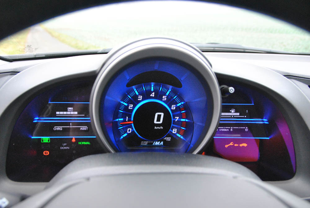 Ze všech tlačítek, které mimochodem dobře a přehledně uspořádané, zaujmou tři na levé straně. Slouží k volbě jízdního režimu – Econ, Normal a Sport. Záleží na vás, jaký styl jízdy chcete upřednostnit. Přiznáme, že na Econ, kdy sbíráte za hospodárnou jízdy kytičky a lístečky (viz Test Honda Insight) jsme pouze vyzkoušeli, protože ke sportovně laděnému kupé nám jaksi nepasoval. Většinou jsme jezdili na Normal nebo Sport. Jaký režim jste zvolili vám napoví podsvícení „budíků“ od zelené před modrou po červené. Jednotlivé režimy se liší nastavením škrticí klapky, posilovače řízení, řízení klimatizace a do jaké míry podporuje spalovací motor hybridní systém IMA.