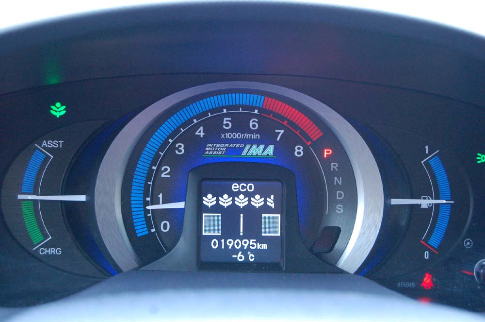 Po otočení klíčku nám hrají přístroje všemi barvami, až z toho přechází zrak. Na futuristické pojení přístrojové desky jsme si u Hondy zvykli, k hybridu se pak hodí určitě dvojnásob. Jako bychom usedli do kokpitu malého letadla. Při pohodlné pozici za pěkným volantem nám bohužel zůstal ukrytý digitální displej rychloměru. To je snad jedná podstatná vada na kráse. Na druhou stranu mezi všemi ovladači se po chvilce rychle zorientujete a pak už vám nic nepřipadá složité, jak se na první pohled zdá. Ergonomie je jedničku.