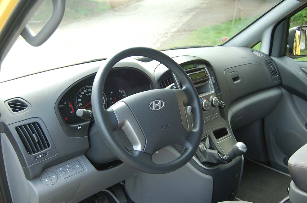Poloměr otáčení považujeme rovněž za jednu z předností „há-jedničky“, stejně jako přeplňovaný vznětový čtyřválec s přímým vstřikem paliva common-rail a variabilní geometrií lopatek. Objem 2,5 litru poskytuje výkon 170 k při 3800 otáčkách za minutu (o 30 k více než v předchozí verzi), a síla 400 Nm je pro běžný provoz plně dostačující a zároveň skrývá v sobě i dost rezervy pro předjíždění. Potěší určitě dobrý a plynulý zátah již z nízkých otáček. Překvapila nás velice příznivá spotřeba kolem 8,5 litru na sto kilometrů, a to i při svižnější jízdě. Tato pohonná jednotka je jediná, která se pro H-1 dodává. Bezpečnou jízdu zvyšují kotoučové brzdy na všech kol, systém ABS i ESP