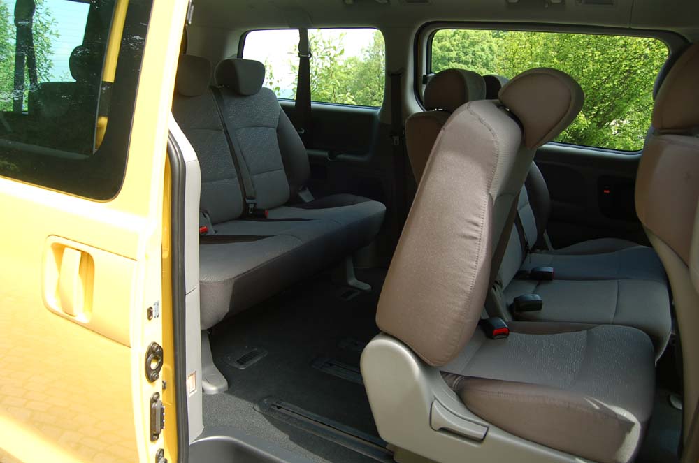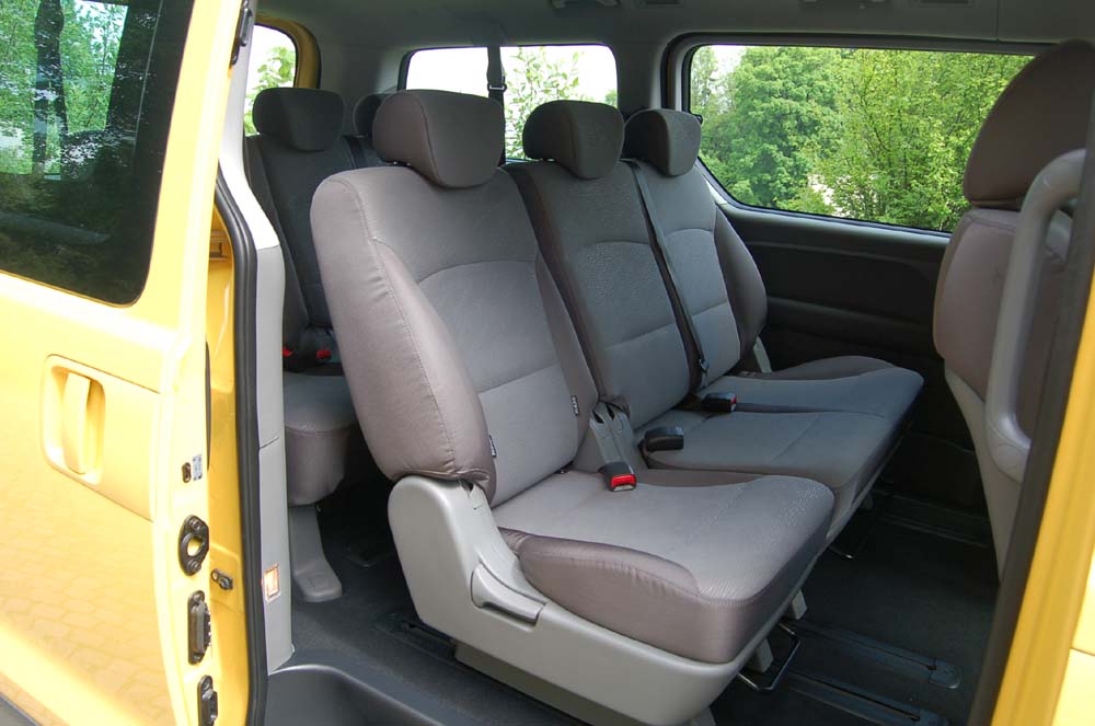 Vzhled charakterizuje mohutná maska chladiče, velké vertikální světlomety a výrazné prolisy nad koly. Mna obou stranách jsou rozměrné posuvné dveře, vzadu pak výklopná stěna. Interiér je vkusný, přístrojová deska přehledná a srozumitelná, řadicí páka „po ruce“ na středovém panelu. Sedadla jsou pohodlná i na dlouhé cestě, druhá řada je podélně posuvná. Přístup k třetí řadě je sice trochu obtížnější, ale chce to jen cvik. V osmimístné verzi se však musíme uskrovnit při převozu zavazadel, neboť úložný objem je pouze 850 litrů. Tak nás napadlo, jestli by pro náš trh nebyla přeci jen výhodnější a praktičtější osobní pětimístná verze (Ta existuje pouze ve verzi Van s přepážkou N1), zvláště když sedadla třetí řady nelze bez nářadí vyjmout. Tím by se objem mohl zvětšit až na nějakých 2500 litrů.