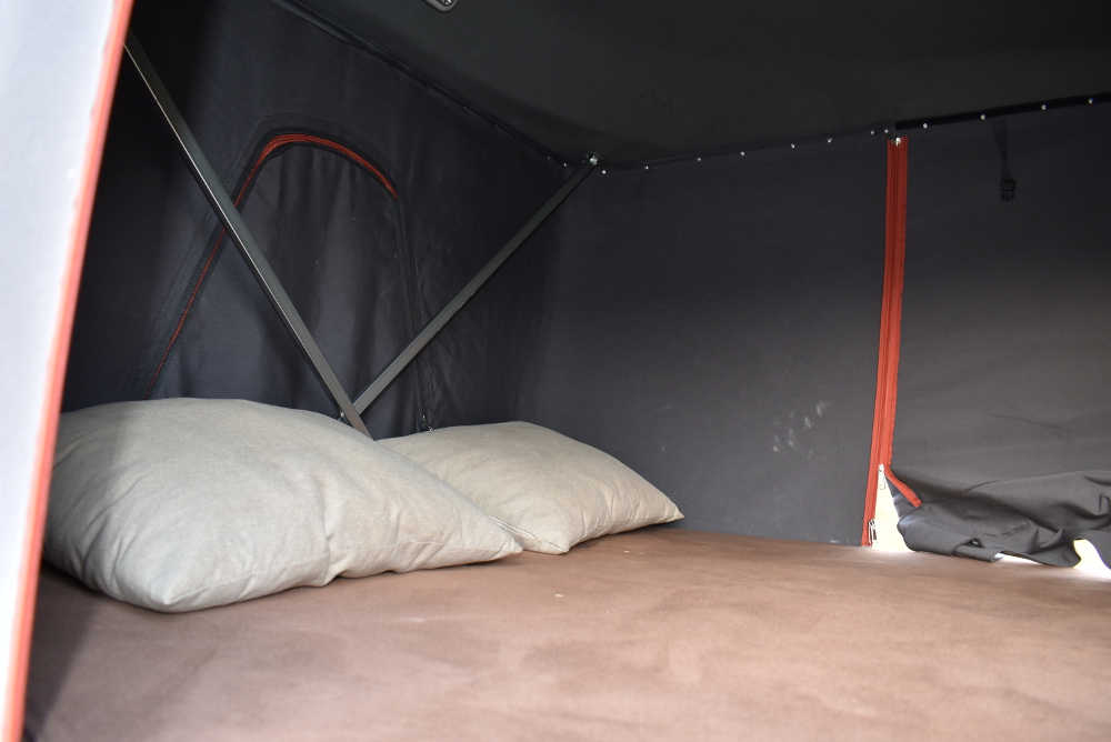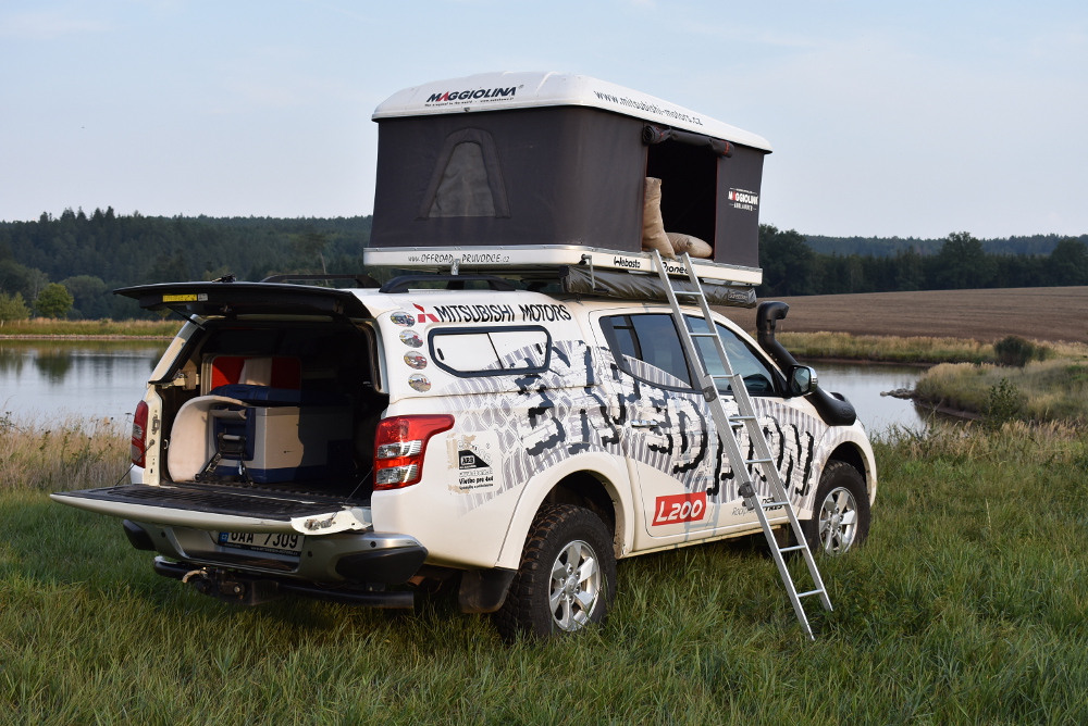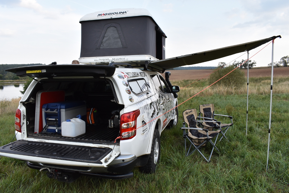 Na pohled poznáte pikap nejen podle „afrického“ maskování, ale především díky střešnímu stanu, v němž jsme se pohodlně vyspali ve dvou. Překvapila nás i kvalitní měkká matrace. Ve složeném stavu v něm lze převážet ještě skládací hliníkový žebřík. Zatímco jeho rozdělání klikou je dílem okamžiku, složení je o něco složitější, neboť musíte neustále hlídat a zastrkávat přečnívající látku pod horní kryt než zasedne k dolnímu krytu. Chcete to trénink.