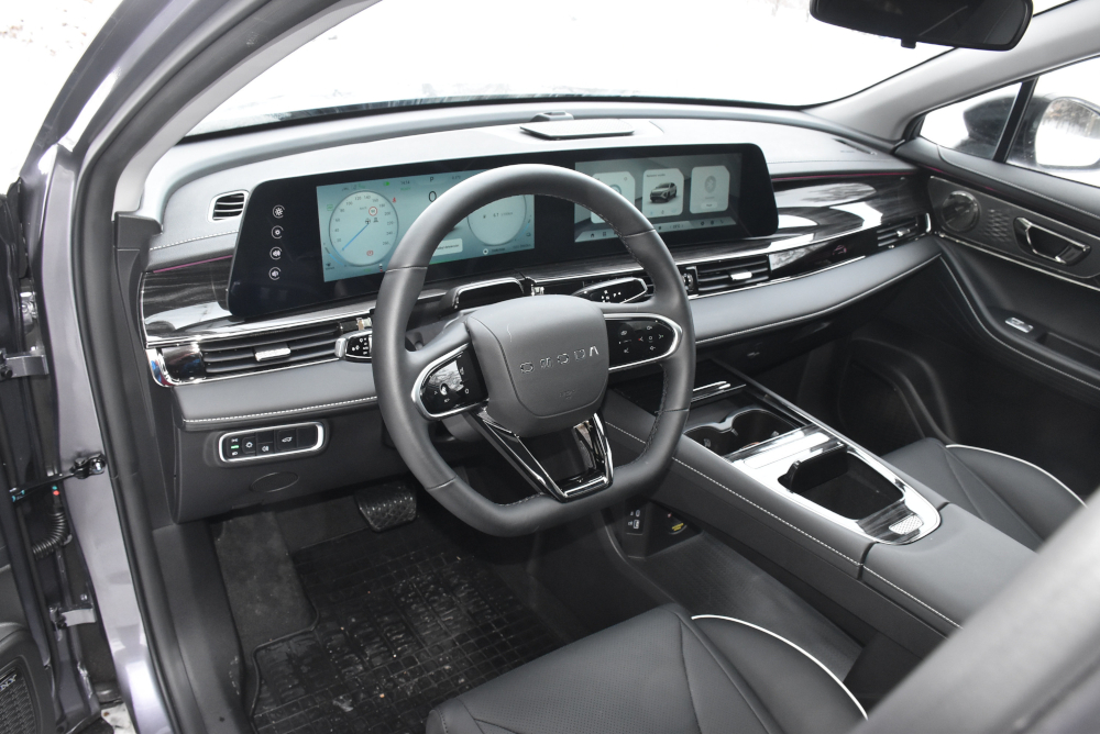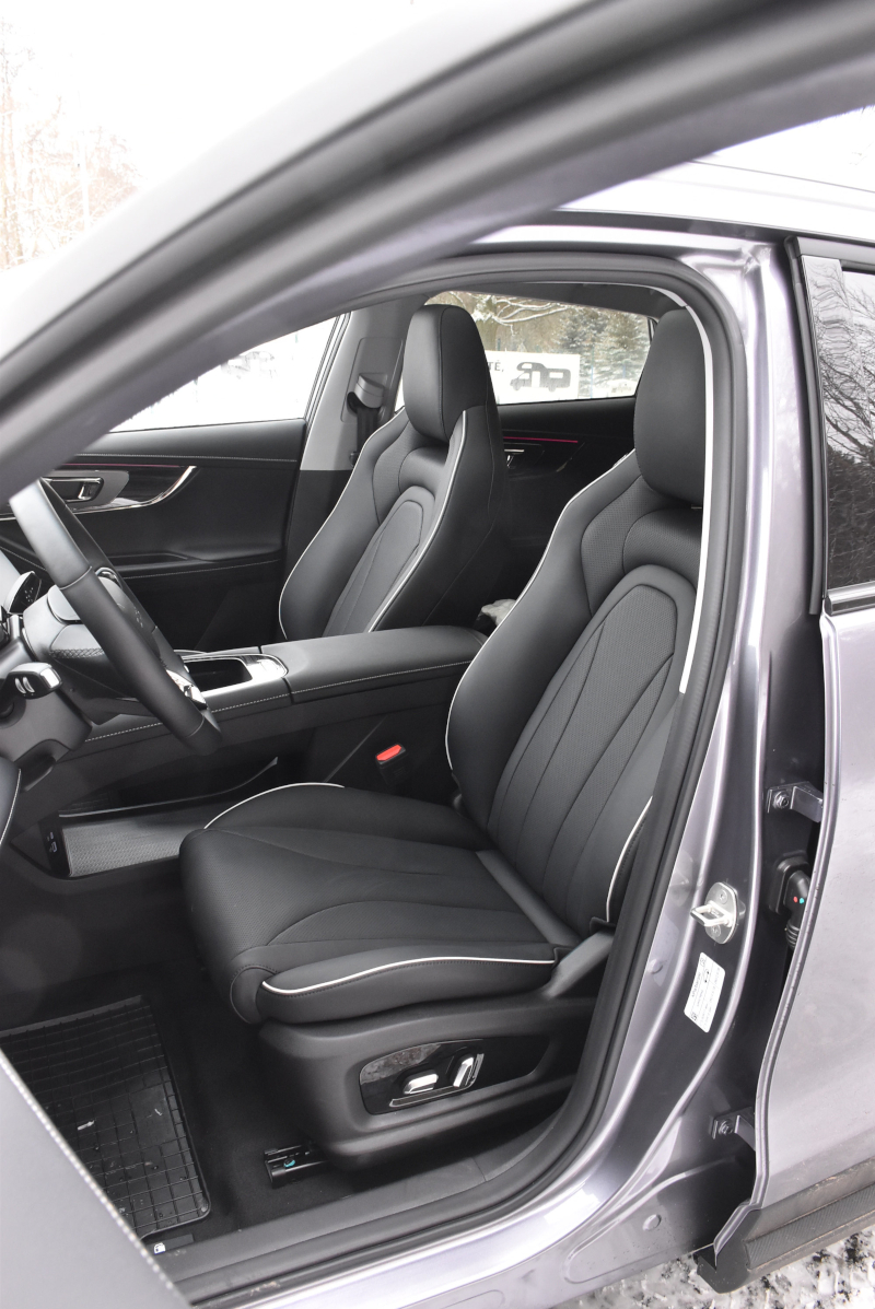 Kokpitu dominují dva 12,3palcové displeje, které se táhnou přes palubní desku v jednom souvislém panelu. Vlevo je plně digitální kokpit, vpravo infotainment systém s rychlou dobou odezvy a ostrým zobrazením. Zajímavostí je umístění voliče automatické převodovky do sloupku řízení, s tímto řešením jsme se ještě nesetkali.