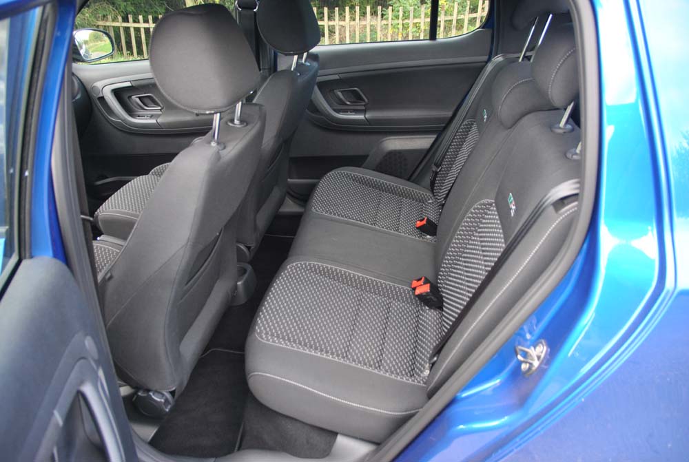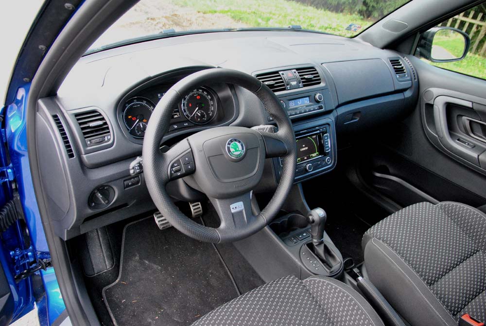 Uvnitř nám padnou do oka pěkné anatomická přední sedala se skvělou boční oporou. Jízda v nich je jedna radost, připadáte si jako v opravdovém sporťáku a při rychlém projíždění ostrých zatáček vás pěkně podrží. Kromě hliníkových pedálů a páček pod volantem pro ruční řazení je přístrojová deska hodně podobná běžné Fabii. Vlevo od volantu je tlačítko vypínatelného protiprokluzového systému, zatímco ESP deaktivovat nelze.