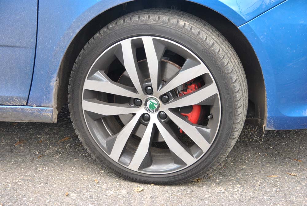 Na pohled se Fabia RS pozná podle mohutné masky chladiče s chromem, nápadného „plástvového“ nárazníku, na zádi pak podle dvojité koncovky výfuku a difuzoru. K to u 17“ kola, za kterými nelze přehlédnout červeně lakované brzdové třmeny.