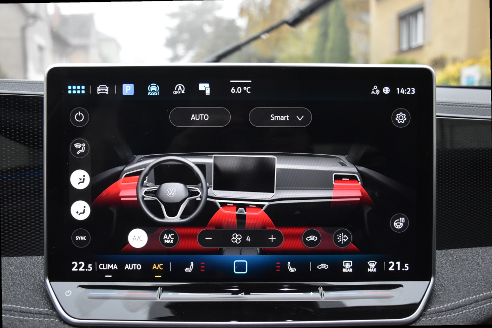 Dotekový displej infotainmentu ( v základu 12,9 palce) vystupuje z palubní desky a nabízí nepřeberné množství funkcí. Jen škoda, že nejsou pod ním klasická tlačítka k ovládání klimatizace jako u Superbu.